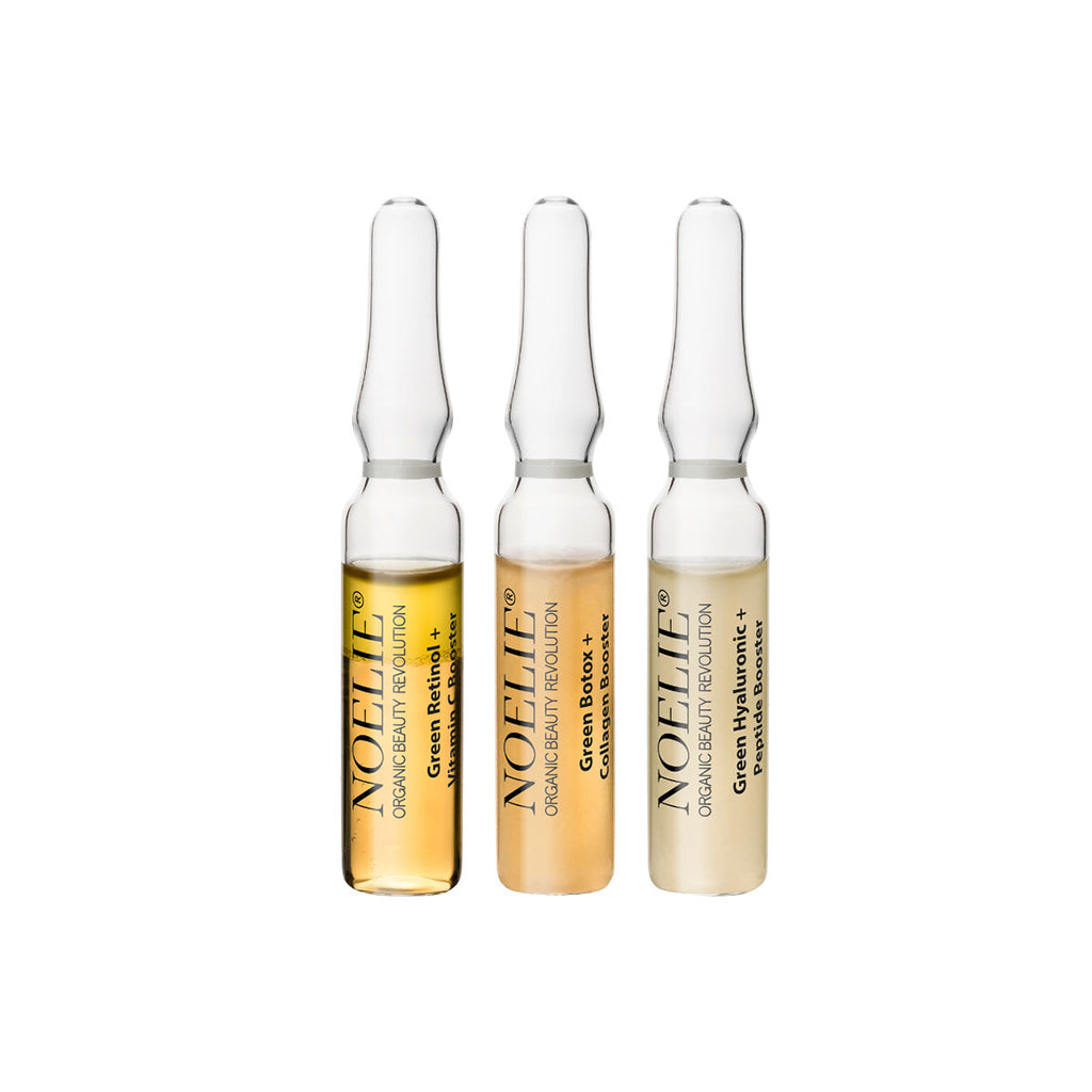 - Ce kit de 3 pièces est notre recommandation basée sur notre longue expérience et comprend le Green Retinol + Vitamin C Booster, le Green Hyaluronic + Peptide Booster et le Green Botox + Collagen Booster.