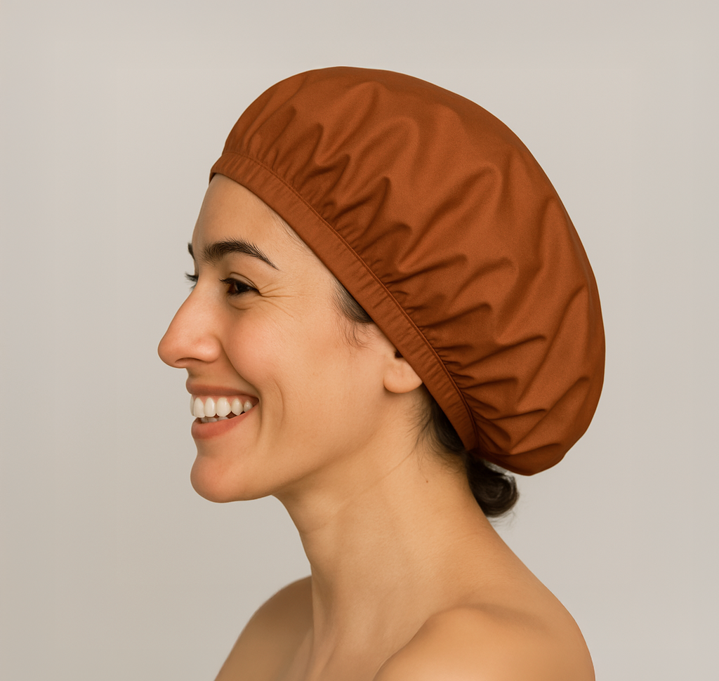 Nach dem Auftragen deiner Haarfarbe die NOELIE Färbehaube sanft auf die Haare setzen, sodass sie den gesamten Kopf gut umschließt. Achte darauf, dass die Haube sicher sitzt und keine Farbreste entweichen können.