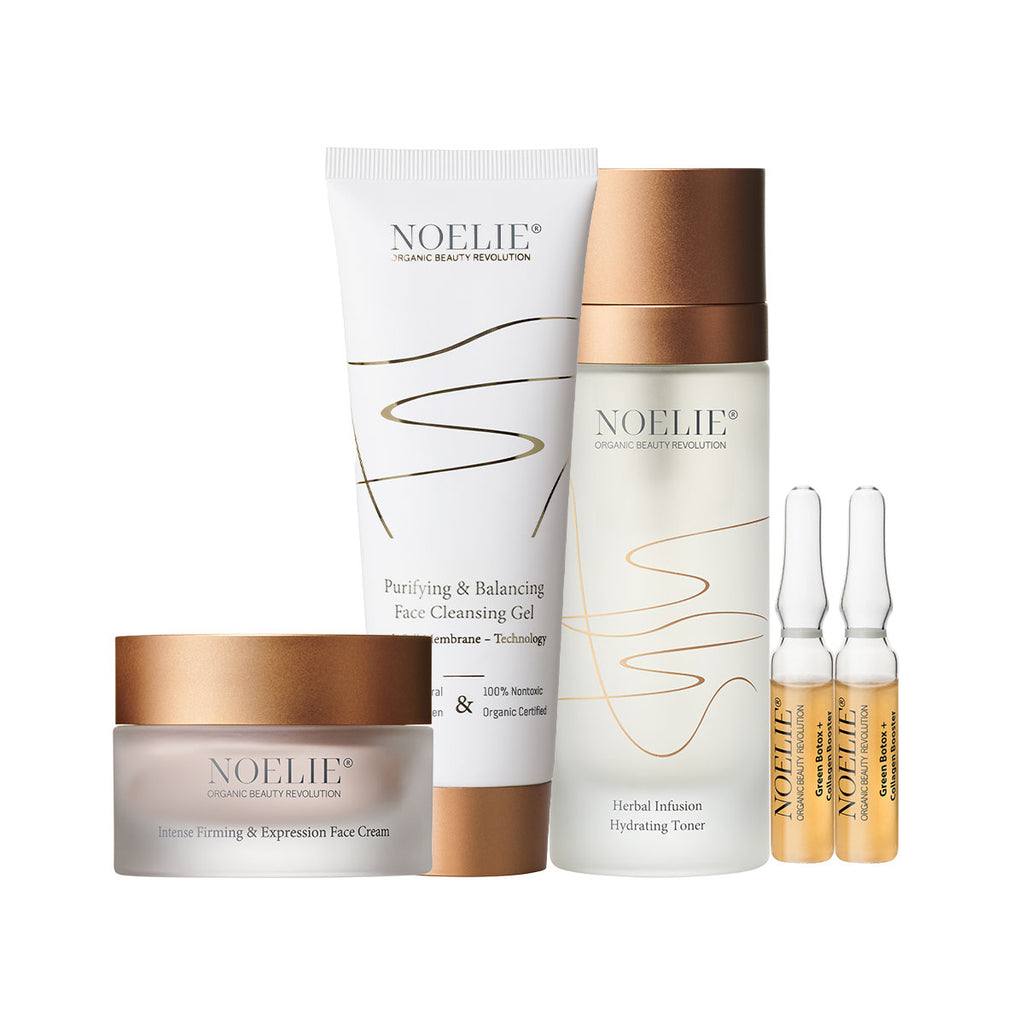 - Das 4-teilige Set besteht aus den folgenden Produkten: dem Moisturising Enzyme Face Cleansing Balm, dem Herbal Infusion Hydrating Toner, der Green Beautox + Collagen Booster Ampulle und der Intense Firming & Expression Face Cream.